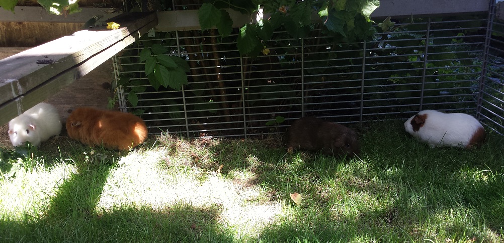 Die beiden Hübschen durften nun gemeinsam zu einem Meerschweinchenpaar in ein wunderschönes großes Gehege ziehen. Die Vergesellschaftung verlief völlig problemlos und bereits nach kurzer Zeit saßen alle vier gemeinsam in der Sonne. Die Außenhaltung ist vorbildlich und das ganze Quartett wird liebevoll umsorgt. Für den Winter kommt noch eine zweite Isolierung hinzu damit die vier es dann auch schön kuschelig haben. Aber erstmal wird jetzt das schöne Wetter und der Auslauf zum Grasen ausgenutzt.
