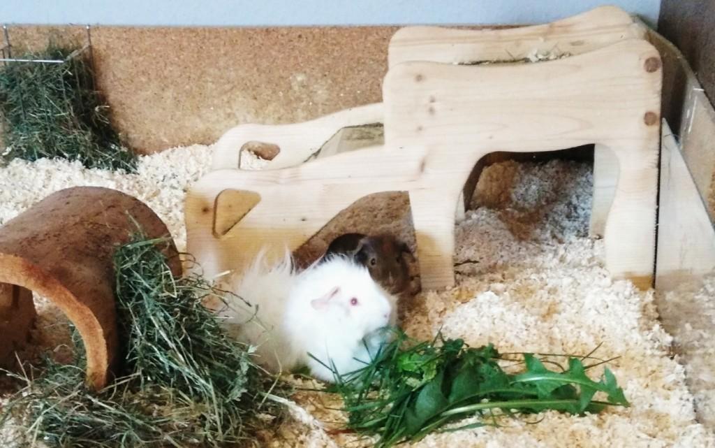 Die beiden stammen aus dem Gräfelfinger Notfall und waren als Pflegetiere in einem Haushalt untergebracht, in dem schon vier Heuwuslertiere leben. Für die Unterbringung wurde ein "provisorisches" Gehege gebaut, für das das Fitnessgerät im Wohnzimmer weichen musste. Ganz nach dem Motto "Wer braucht schon eine Bikinifigur, wenn er Babymeerschweinchen betreuen kann" wanderte der Crosstrainer in die Abstellkammer. Jakarta und Johannes tauten bald auf und wurden zutraulich und aktiv. Die beiden veranstalten mehrmals täglich Rennen, sodass das Eckgehege kurzerhand länglich umgebaut wurde, damit die beiden die 2,5 Meter voll ausnutzen können. Dem Crosstrainer folgte dafür ein Sessel in die Abstellkammer. Junge Schweine brauchen aber etwas mehr Beschäftigung als z.B. die Senioren, die im Haushalt leben, daher bekamen sie eine Brücke ins Gehege. Diesen 1. Stock nutzen sie ausgiebig und lassen die Treppe oft aus, indem sie aus dem Stand nach oben springen. Eines Tages stellten die Pflegeeltern fest, dass sie auch gut ohne Fitnessgerät und Sessel leben können und Jakarta und Johannes eigentlich gar nicht mehr hergeben möchten. Aus den eigentlichen Pflegetieren, die zur Weitervermittlung bestimmt waren, wurden eigene. Das Gehege wird demnächst erneut umgebaut und erhält durch eine Rampe Zugang zum Boden, damit die beiden Wusler noch mehr