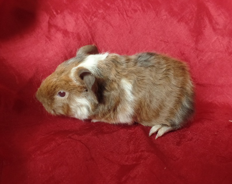 Monroe hat wie seine Geschwister seinen Namen aus der Serie „Grimm“. Er war zusammen mit seinem Bruder Nick bei seiner Geburt der Kleinste der Sechslinge. Das merkt man ihm aber gar nicht mehr an. Wie es sich für einen echten vegetarischen„Blutbader“ gehört, liebt er rote Beete. Oft sieht man ihn mit seiner Schwester Theresa um die besten Stücke rangeln. Da sich beide ähnlich sehen, ist das ein echt lustiger Anblick! Nick folgt Monroe auch sehr gern, denn der ist der mutigere der beiden Brüder. Er wird sicher einmal ein selbstbewusster Haremsführer. Inzwischen ist Monroe handzahm. Er folgt seinen Menschen wie ein Hund bis ans Ende des Freilaufs und würde sicher auch durch die ganze Wohnung hinterherlaufen. Für Erbsenflocken tut er alles, Männchen machen und sogar sich das Köpfchen kraulen zu lassen. Er hat wuscheliges Fell, ist ein Teddy-Mix. Wie seine Geschwister und Mama Bonita hat auch er die süßen Himbeeräuglein geerbt. Es stimmt übrigens nicht, dass rotäugige Meerschweinchen besonders lichtempfindlich wären. Sie dürfen genauso in den Garten, wie ihre dunkeläugigen Artgenossen! Monroe ist bereits frühkastriert und ist bereit für die Damenwelt.