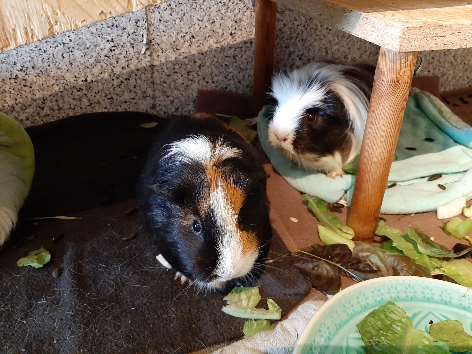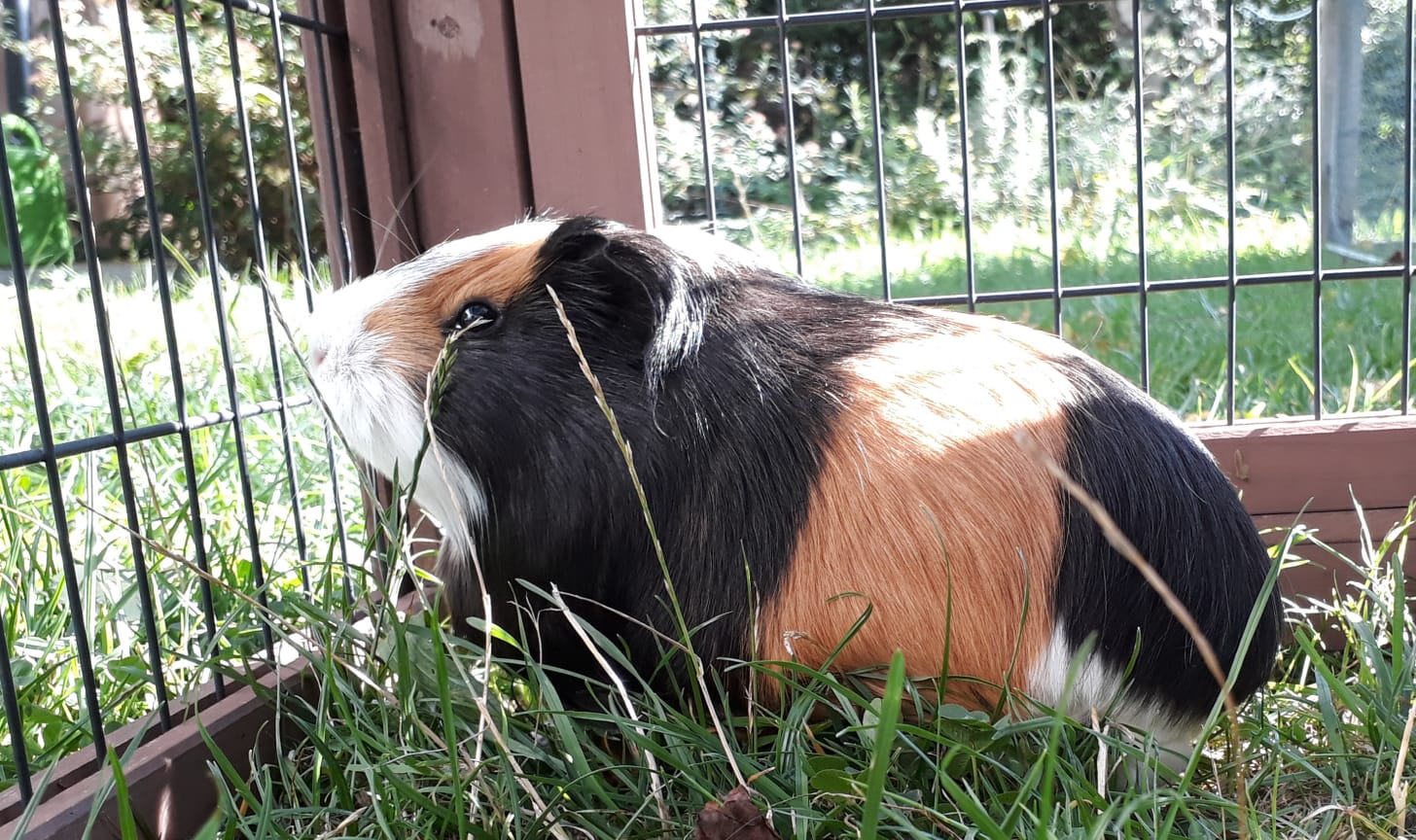 Die Vergesellschaftung war gar nicht so einfach. Maral kannte – bis auf die schrecklichen Erfahrungen aus dem Animal-Hoarding Notfall – keine großen Gruppen und ist vor Angst immer weggelaufen wenn ein Schwein nur in ihre Richtung geschaut hat. Nur Locke, der Kastrat, durfte nah an sie ran. Maral versteckte sich erst immer und traute sich nicht zu den anderen. Mit viel Geduld und gutem Futter wurde es aber langsam besser und 2 Tage lang war das übliche Kennenlernprogramm angesagt: beschnuppern, verjagen, meckern und quietschen. Inzwischen kommt Maral sogar schon laut quieckend angelaufen wenn es Futter gibt und frisst auch mitten in der Gruppe. Es wird sicher noch ein paar Tage dauern bis die kleine Maus ihren Platz und Rang in der Gruppe gefunden hat aber hier wird nichts erzwungen und Maral bekommt die Zeit die sie benötigt. Somit bleibt Maral bzw. jetzt Luca ihr Leben lang ein Heuwusler.