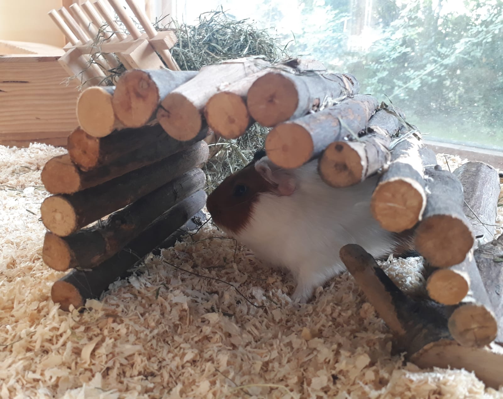 Der hübsche Oliver tat, was Babymeerschweinchen so den ganzen Tag über tun: Rumflitzen, alles probieren, was die Mama auch frisst und dann wieder gemütlich irgendwo schlafen. Nach kurzer Zeit ging es wieder von vorne los und er flitzte zusammen mit seinen Geschwistern durchs Gehege, dass die Späne nur so flogen. Eine wahre Freude ihm zuzuschauen. Auch Gartenausflüge bei schönem Wetter kannte die ganze Familie schon. Besonders gut hatte Mama Olivia ihnen das Einsteigen in die Transportbox gelernt (siehe Video facebook).