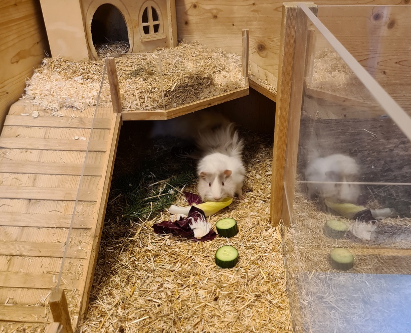 Beide Buben sehr agil, Pumbaa ist mutiger, nimmt schon Leckerli aus der Hand und ist immer vorne mit dabei, auch dominanter als Mufasa, der ist etwas schüchtern und bleibt immer in der Nähe anderer Schweinchen. Beide lieben die Hängematte. Mufasa wurde am 29.12.2020 frühkastriert.