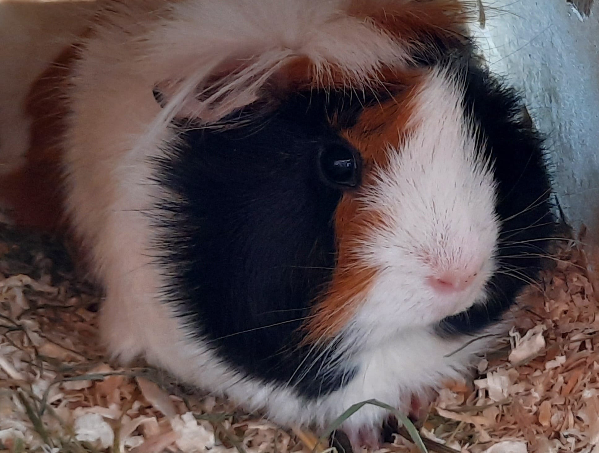 Popcorn ist ein dreifarbiges Rosetten-Mädel. Neugierig erkundete sie ihre Umgebung und saß auch gerne mal oben in der Heuraufe oder auf dem Häuschen. Gesundes Futter kannte das Mädel schon und auch neue Gemüsesorten wurden vorsichtig probiert. Den Gesundheitscheck hatte sie mit Bravour bestanden und auch die Kotprobe war in Ordnung, sodass einem Auszug nicht im Wege stand.