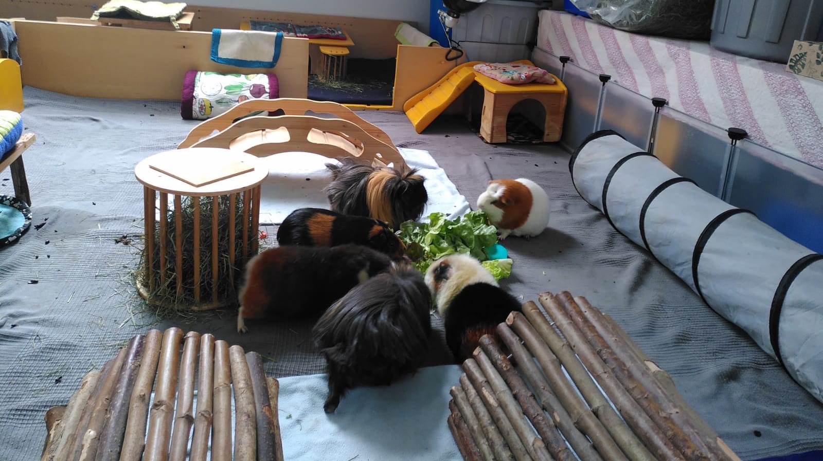 Unser Wonneproppen Gwain hat alles richtig gemacht und durfte in ein absolutes 5‑Sterne-Delux-Zuhause umziehen. Bei Betty & Marco ist leider Kastrat Panda nach langer und sehr schwerer Krankheit verstorben und die 5 Damen kommen ohne männliche Unterstützung nicht so ganz klar. Da unter den Damen auch 2 behinderte/gehandicapte Schweinchen leben musste es ein Bub sein der nicht zu aufdringlich ist aber doch versteht das er der Kerl ist. Daher haben wir dem Hennenhaufen Gwain vorgestellt. Und was soll man sagen; für sein doch noch sehr junges Alter hat er seinen Job wirklich erstklassig gemacht. Charmant brommseln & popowackeln, dabei respektvoll und nicht aufdringlich – so hat er die Damen von sich überzeugt. Gerade die älteste Dame, die den Kastratenjob übernommen hatte, war sehr angetan von dem jungen feschen Kerlchen das da plötzlich rumlief. Die jungen Damen waren relativ neutral und sogar Zicke Othilia hat sich zurückgehalten. Nur Handicap-Schweinchen Mathilda braucht einfach immer länger um neue Mitbewohner zu akzeptieren – aber hier sind wir uns sicher auch sie wird Gwain mit seiner ungemein tollen Art noch knacken. Hier kann sich Gwain zu einem absoluten Mega-Kastraten entwickeln und seinen Harem souverän führen. Die Pflegestelle von Gwain ist sowas von stolz auf den kleinen Mann und ist völlig aus dem Häuschen dass er hier einziehen durfte.