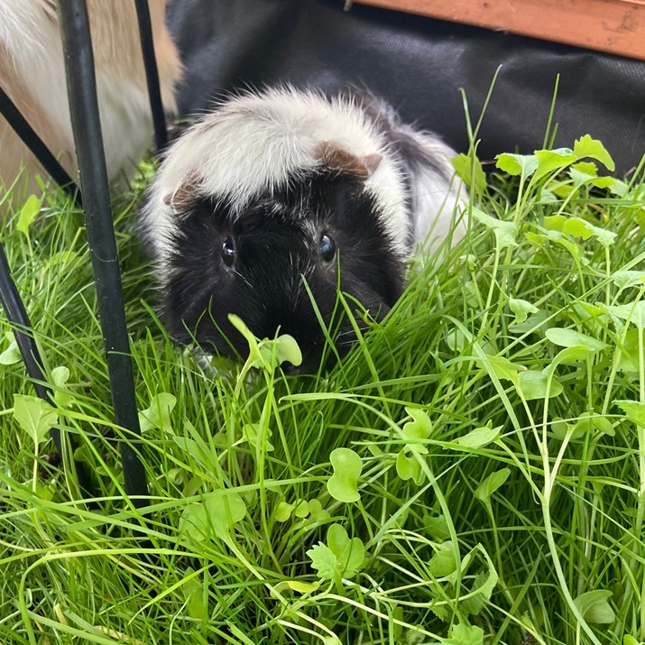Aber die Beiden hatten Glück im Unglück und durften nach relativ kurzer Wartezeit zusammen in ein neues Zuhause ziehen. Die Vergesellschaftung dort verlief ohne Probleme, das kleine Rudel hat ein ganzes Zimmer für sich und daher viel Platz, um ein abwechslungsreiches Leben mit vielen Abenteuerplätzen zu genießen. Inzwischen wurde auf dem Balkon auch noch ein Meerschweinchenbereich geschaffen, auf dem die Tiere bei schönem Wetter im echten Gras herumtollen dürfen.