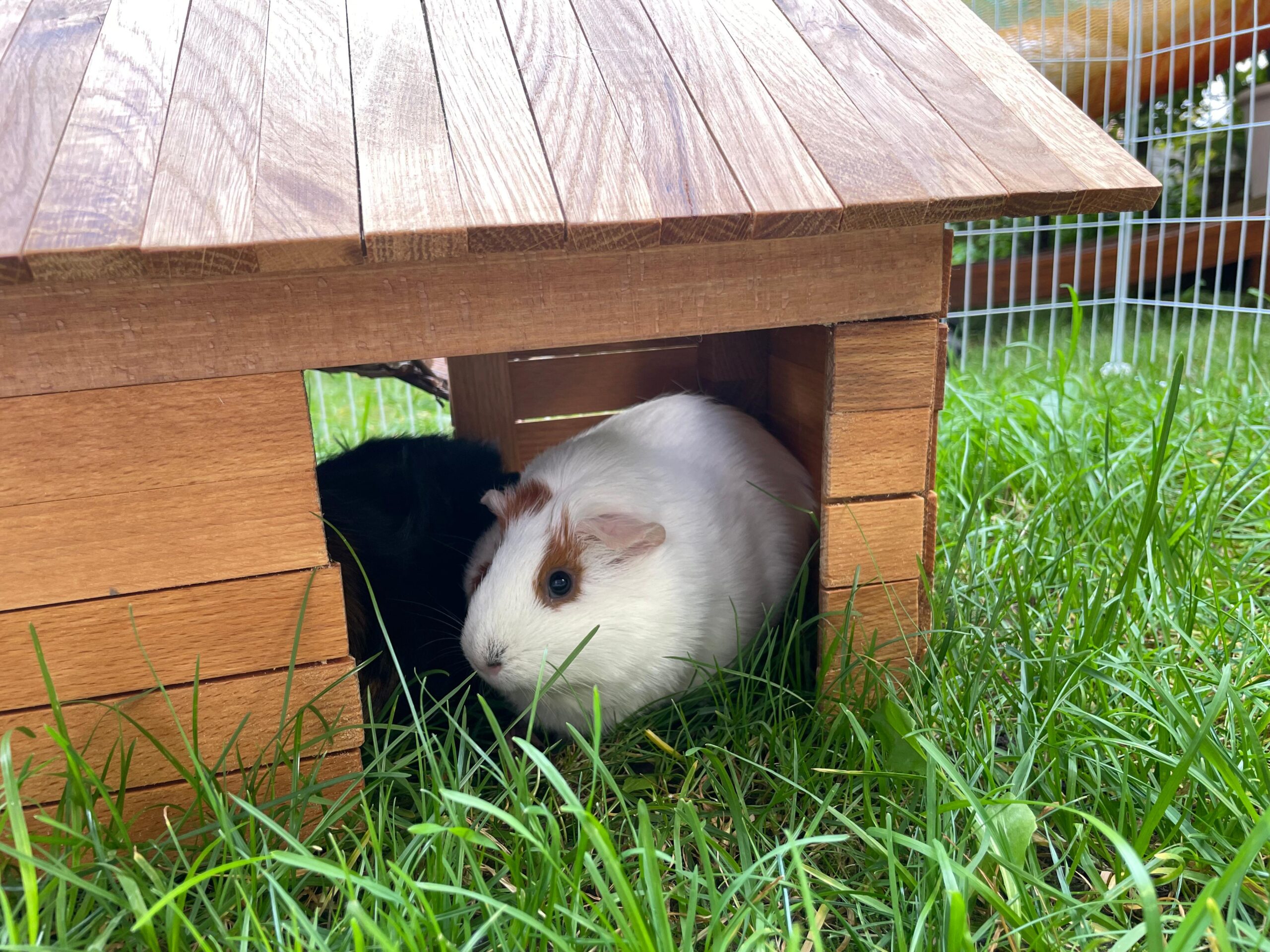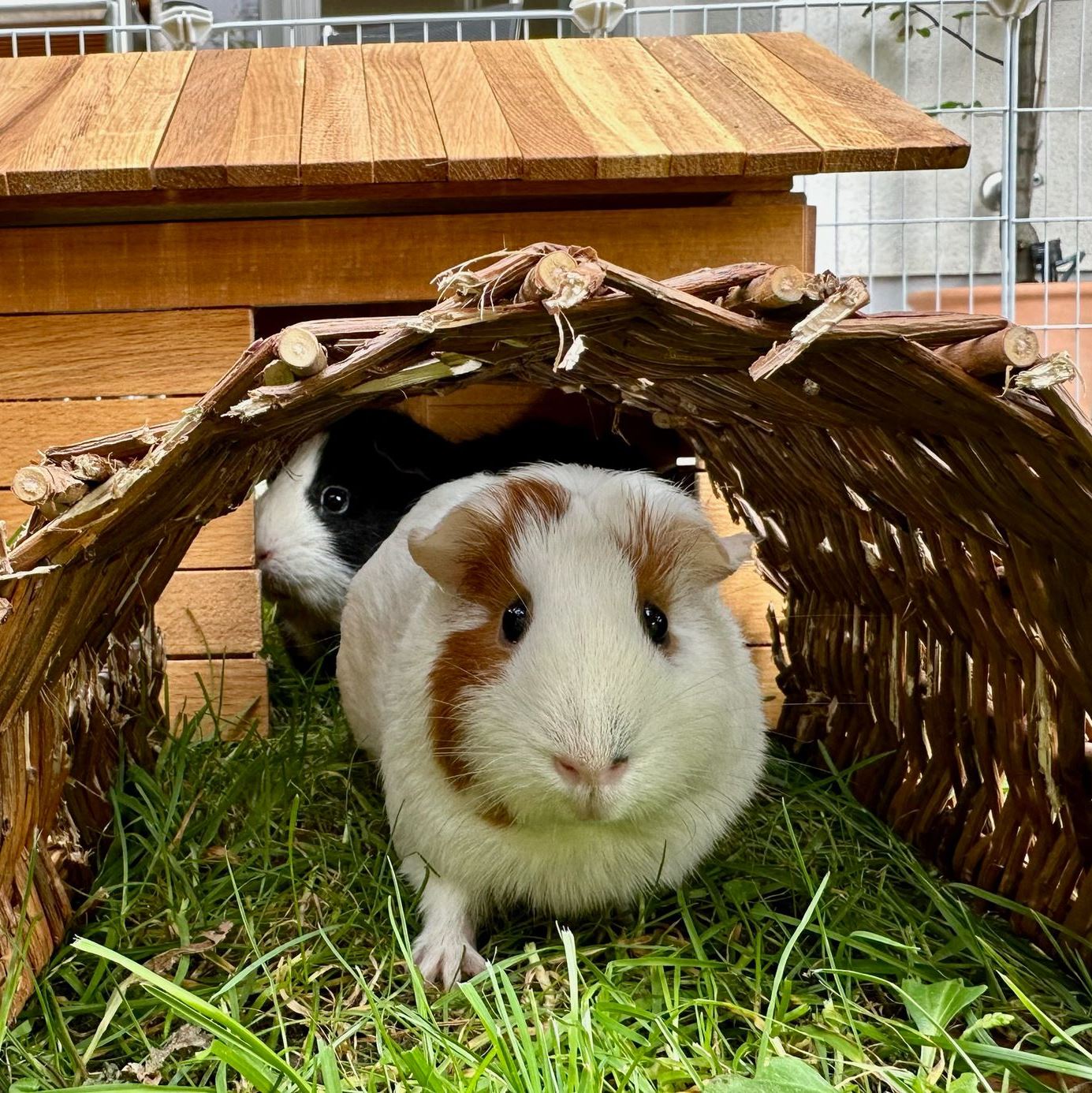 Nach eini­ger Zeit hat sich gezeigt, dass Hose von Keks und St. Mar­tin immer wie­der gemobbt und auch gezwickt wur­de und so haben wir uns ent­schlos­sen, das Trio zu tren­nen. Hose war sicht­lich erleich­tert und hat auf der Pfle­ge­stel­le Donerl ken­nen­ge­lernt und zeigt ihm nun, dass man vor Nichts und Nie­man­den Angst haben muss. Hose ist ein wirk­lich lie­bes Mädel, für Lecker­chen macht sie fast Alles, sie steht sofort am Gehe­ge­rand, wenn man das Zim­mer betritt und ist dem Fut­ter sehr zuge­tan. Da sich Donerl sehr an ihr ori­en­tiert, wer­den die Bei­den nur zusam­men ver­mit­telt. Ger­ne kön­nen sie zu ande­re Mädels in ein ruhi­ges Zuhau­se ziehen.