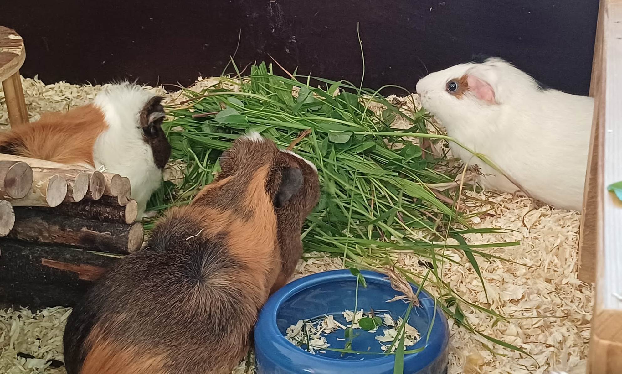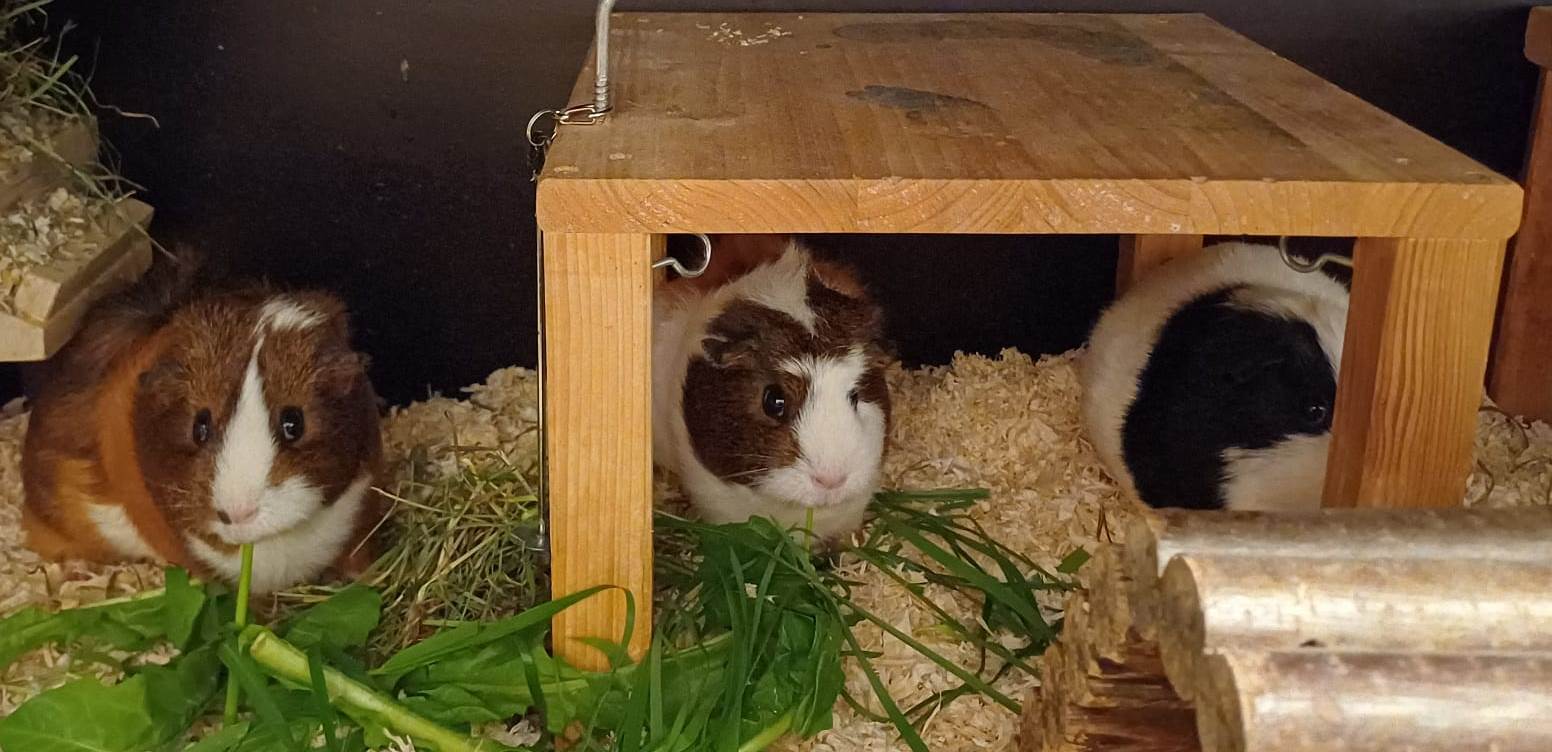 Die Abgabe des Trios fiel sehr schwer und auch die Kinder wollten sich eigentlich nicht von den Tieren trennen. Leider entwickelte die Mutter der Kinder so eine schwere Allergie auf das Heu und die Einstreu, dass sie sogar die letzten Tage aus der Wohnung ausziehen musste. Die drei Meeridamen waren die ersten Tage etwas scheu, haben sich auf der Pflegestelle aber schnell eingelebt und waren nach kurzer Zeit sehr entspannt und auch zutraulich.
