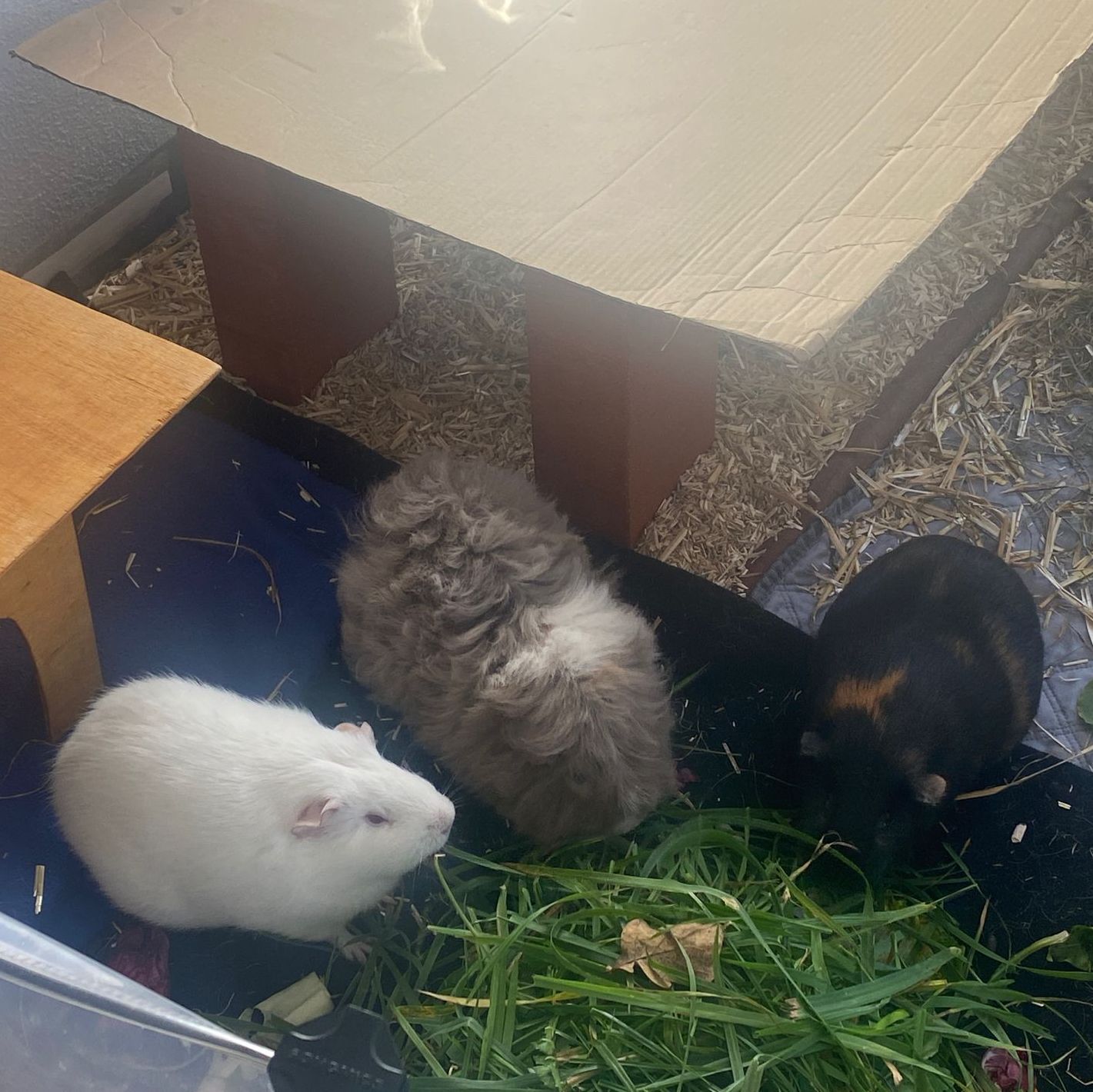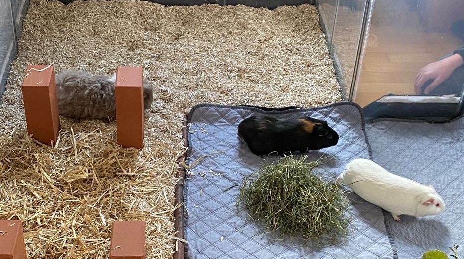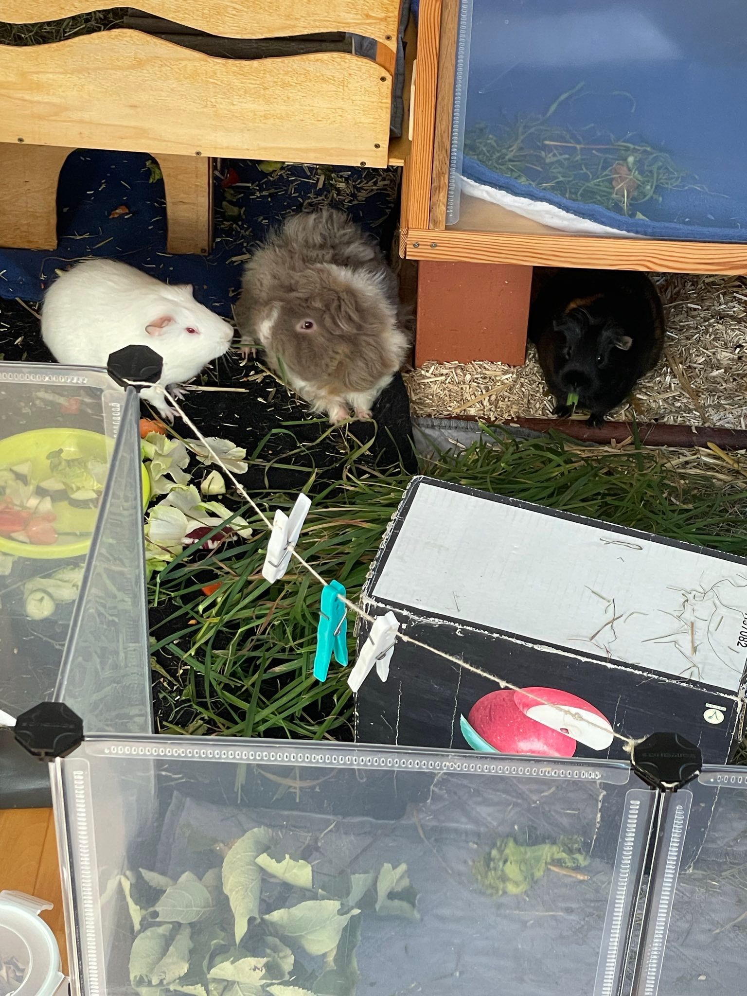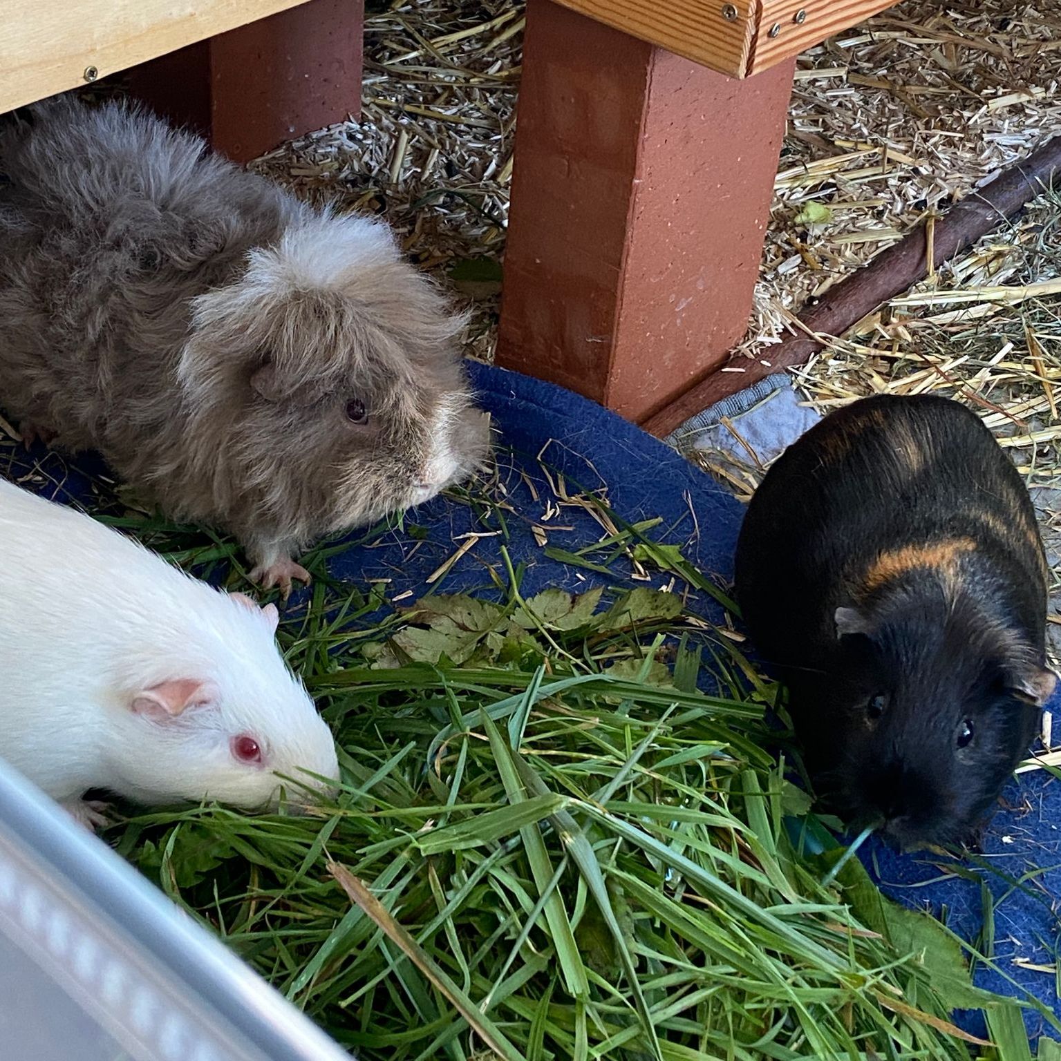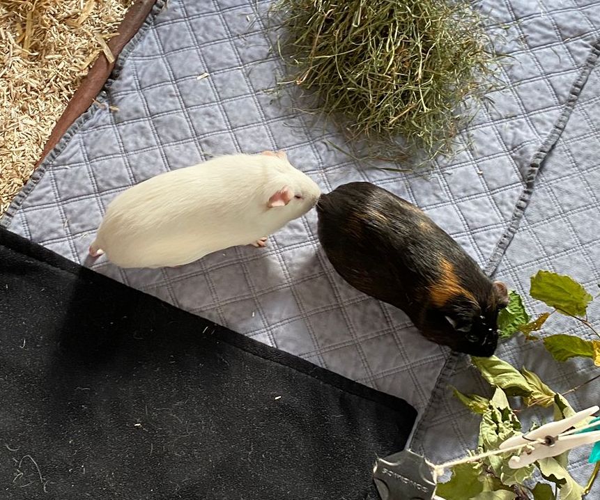 Ella und Lumpi mussten etwas länger warten, bis sich ein perfekter Platz für sie finden ließ. Aber das Warten hat sich gelohnt. Die beiden durften zu einem ehemaligen Labor-Meerschweinchen namens Rubina nach Haar ziehen, wessen Partner verstorben waren. Rubina war immer die Chefin im Gehege und den Rang wollte sie sich auch nicht mehr streitig machen lassen, wodurch die Vergesellschaftung spannend war. Sie hat schon deutlich gemacht, wer die sprichwörtlichen Hosen an hat. Für die Vergesellschaftung wurde zunächst – wie üblich – ein neutrales Gehege aufgebaut und das eigentliche Gehege "rückgebaut", also der Aufbau und die Häuser wurden herausgenommen, damit sie nach dem Umzug ins Gehege viel Platz hatten. Nach ein paar Tagen wurde nach und nach immer mehr in das Gehege gestellt bis es wieder vollumfänglich nutzbar war. Lumpi und auch Ella kommen mittlerweile gut klar und alle drei haben sich angefreundet. Das gemeinsame Fressen mit Rubina funktioniert prima und es ist friedlich im Stall. Sie liegen auch gerne nah bei einander. Und Lumpi hat es ganz wichtig mit dem Brommseln. Wir freuen uns sehr, dass es für das Duo ein Happy-End gab. Wir hätten es nicht übers Herz gebracht sie zu trennen. Und hier zeigte sich mal wieder, dass man oftmals Geduld braucht, bis man mit Harmonie belohnt wird.