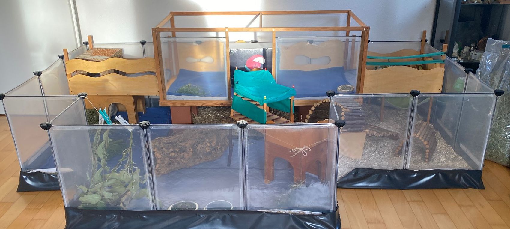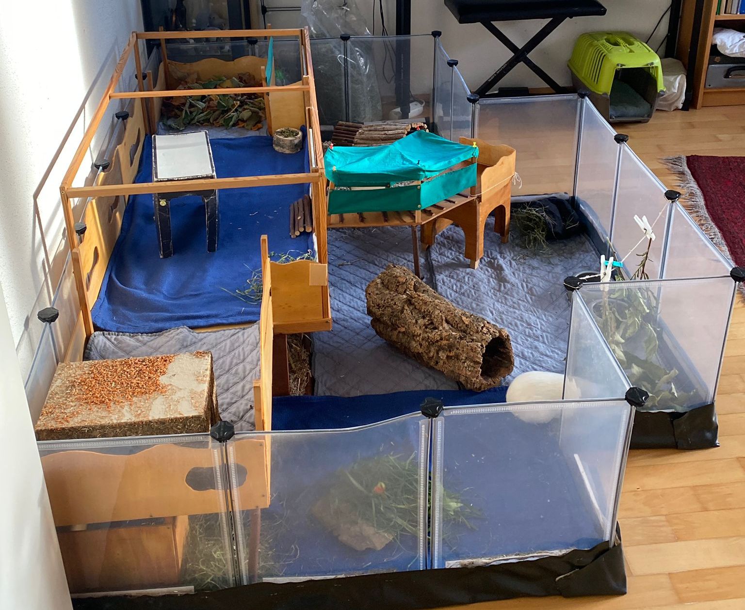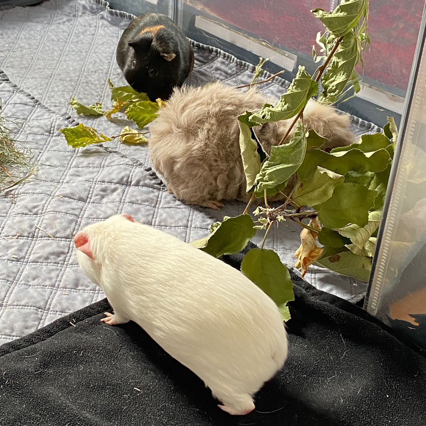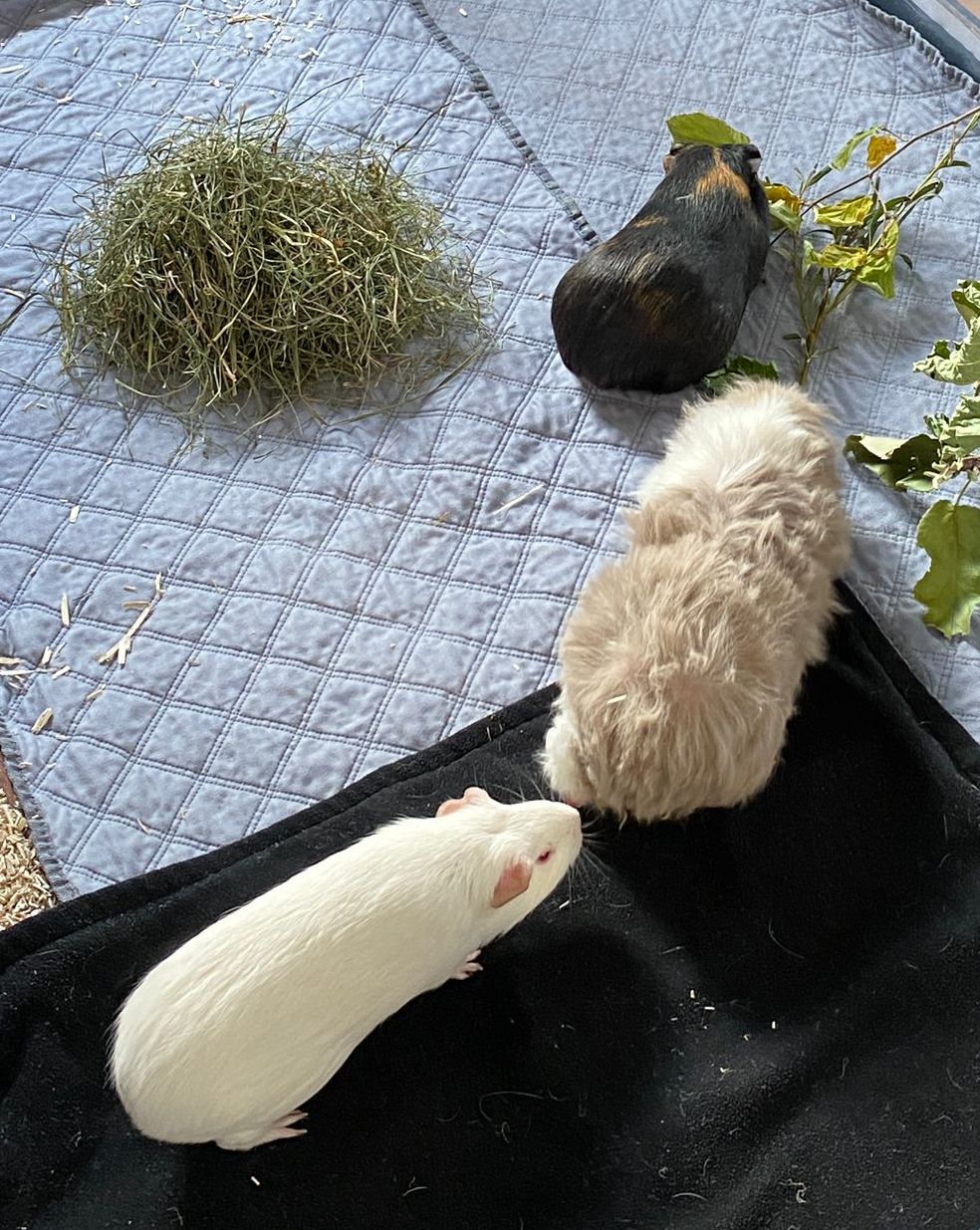 Ella und Lumpi mussten etwas länger warten, bis sich ein perfekter Platz für sie finden ließ. Aber das Warten hat sich gelohnt. Die beiden durften zu einem ehemaligen Labor-Meerschweinchen namens Rubina nach Haar ziehen, wessen Partner verstorben waren. Rubina war immer die Chefin im Gehege und den Rang wollte sie sich auch nicht mehr streitig machen lassen, wodurch die Vergesellschaftung spannend war. Sie hat schon deutlich gemacht, wer die sprichwörtlichen Hosen an hat. Für die Vergesellschaftung wurde zunächst – wie üblich – ein neutrales Gehege aufgebaut und das eigentliche Gehege "rückgebaut", also der Aufbau und die Häuser wurden herausgenommen, damit sie nach dem Umzug ins Gehege viel Platz hatten. Nach ein paar Tagen wurde nach und nach immer mehr in das Gehege gestellt bis es wieder vollumfänglich nutzbar war. Lumpi und auch Ella kommen mittlerweile gut klar und alle drei haben sich angefreundet. Das gemeinsame Fressen mit Rubina funktioniert prima und es ist friedlich im Stall. Sie liegen auch gerne nah bei einander. Und Lumpi hat es ganz wichtig mit dem Brommseln. Wir freuen uns sehr, dass es für das Duo ein Happy-End gab. Wir hätten es nicht übers Herz gebracht sie zu trennen. Und hier zeigte sich mal wieder, dass man oftmals Geduld braucht, bis man mit Harmonie belohnt wird.