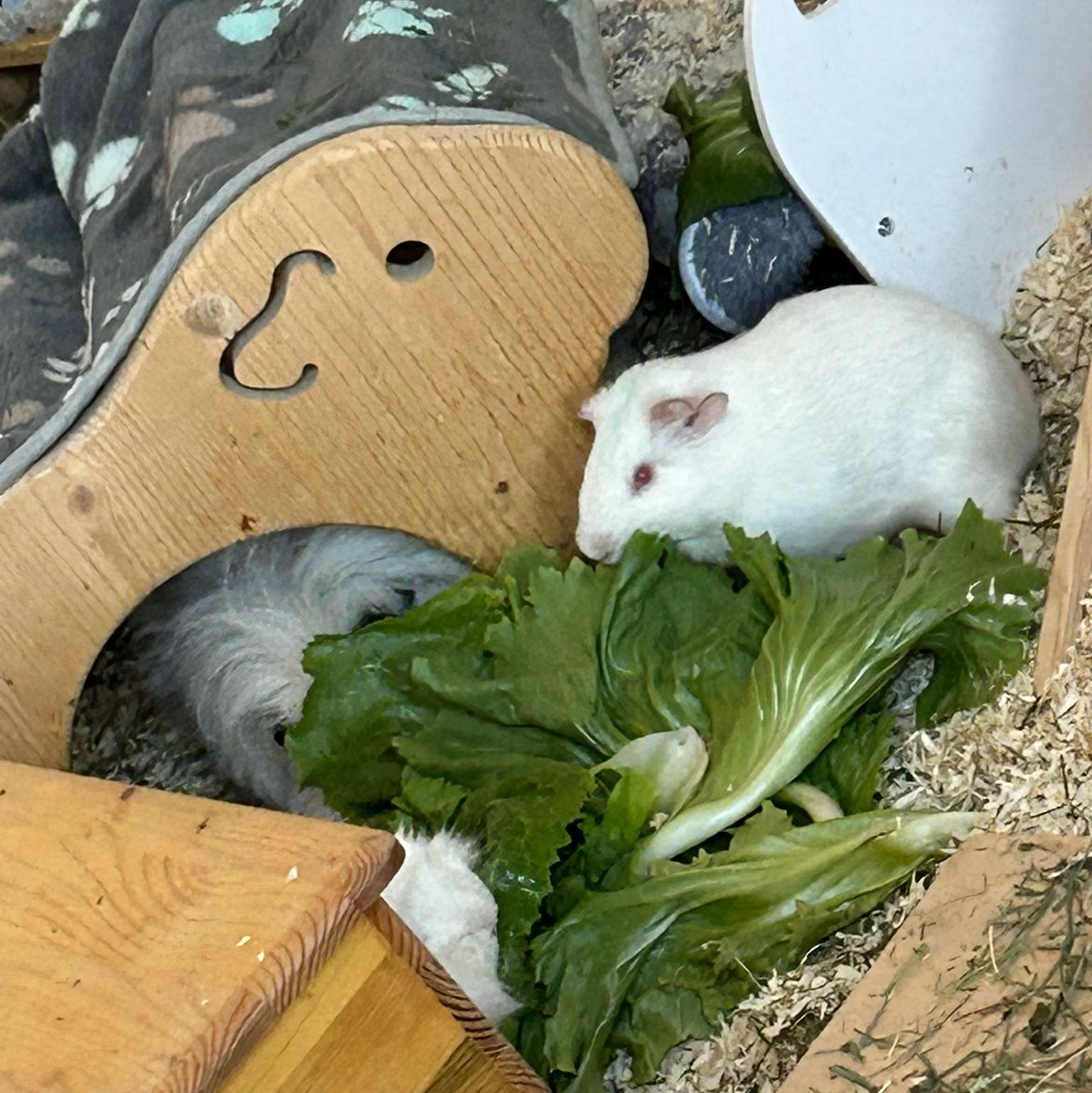Die beiden entwickeln sich prima, haben schön zugenommen, werden von Tag zu Tag zutraulicher. Probieren alles Grünzeug, das sie ja bisher gar nicht kannten. Sie sind vor allem schnell! Und neugierig, mutig, lebenslustig, freundlich zu den anderen Schweinchen… einfach liebenswert! Und ein bisschen frech sind sie auch, Hanni ein bisschen mehr wie Nanni. Die beiden bringen richtig Leben in die Gruppe und selbst die zurückgezogene Kendra ist oft neben den beiden zu sehen. Jim Knopf lässt sich von ihnen sogar den Radiccio klauen- die süßen Zwillinge haben es ihm von Anfang an angetan.