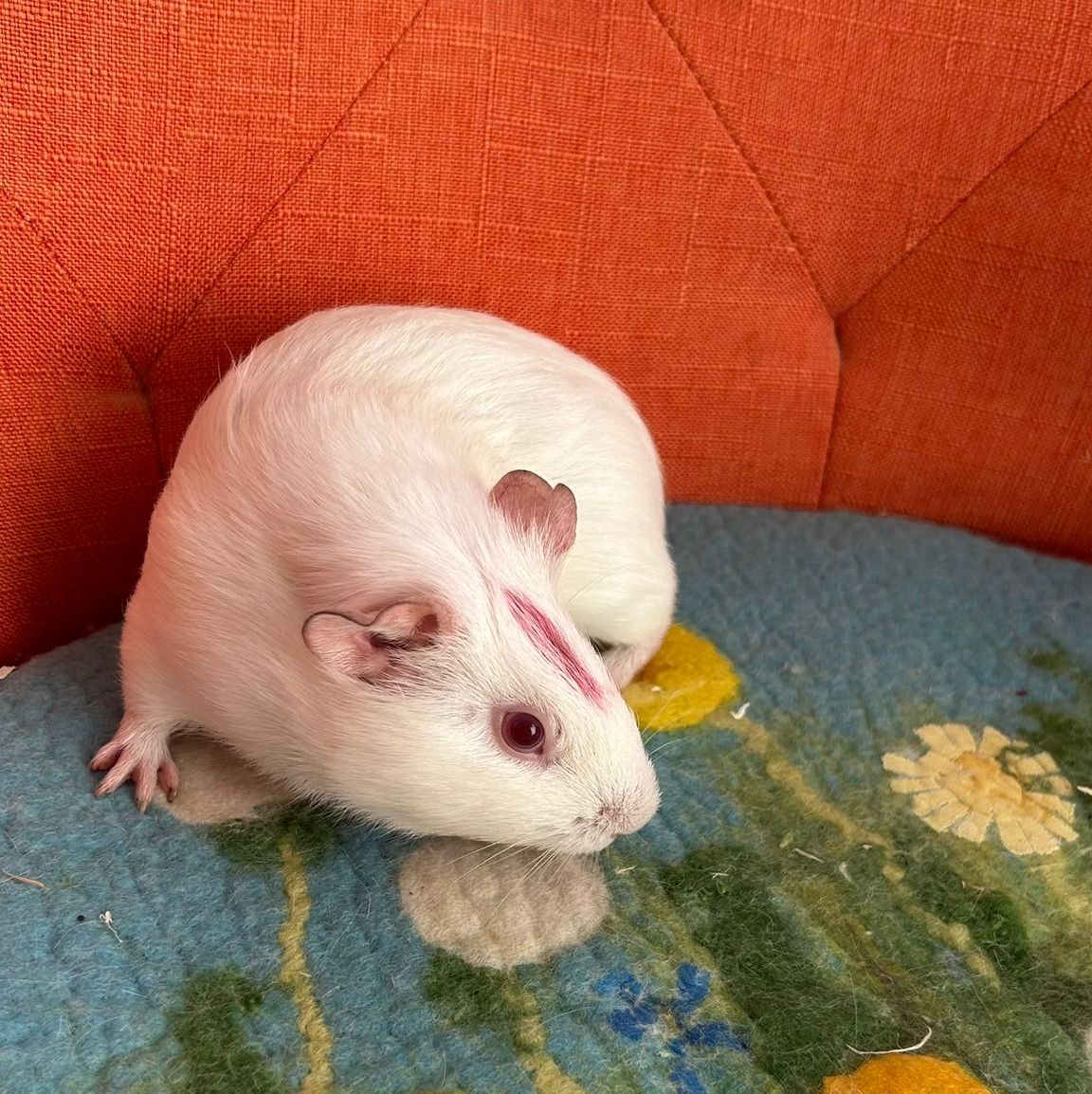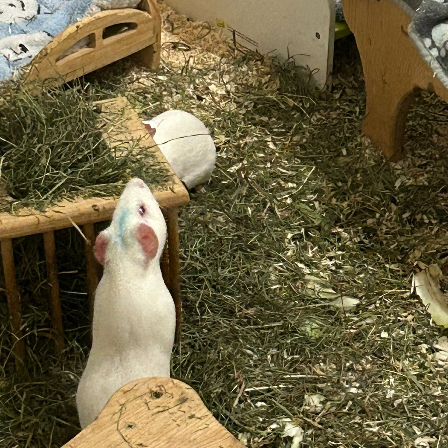 "Vor wenigen Wochen zogen die süßen Zwillinge Hanni und Nanni bei mir ein. Babies, die aus dem Versuchslabor gerettet werden konnten, kleine weiße „Mäuschen“ mit roten Äuglein. Kaum auseinander zu kennen… deshalb werden sie noch mit Lebensmittelfarbe markiert. Hellblau die Hanni mit Hängeöhrchen, rot die Nanni.